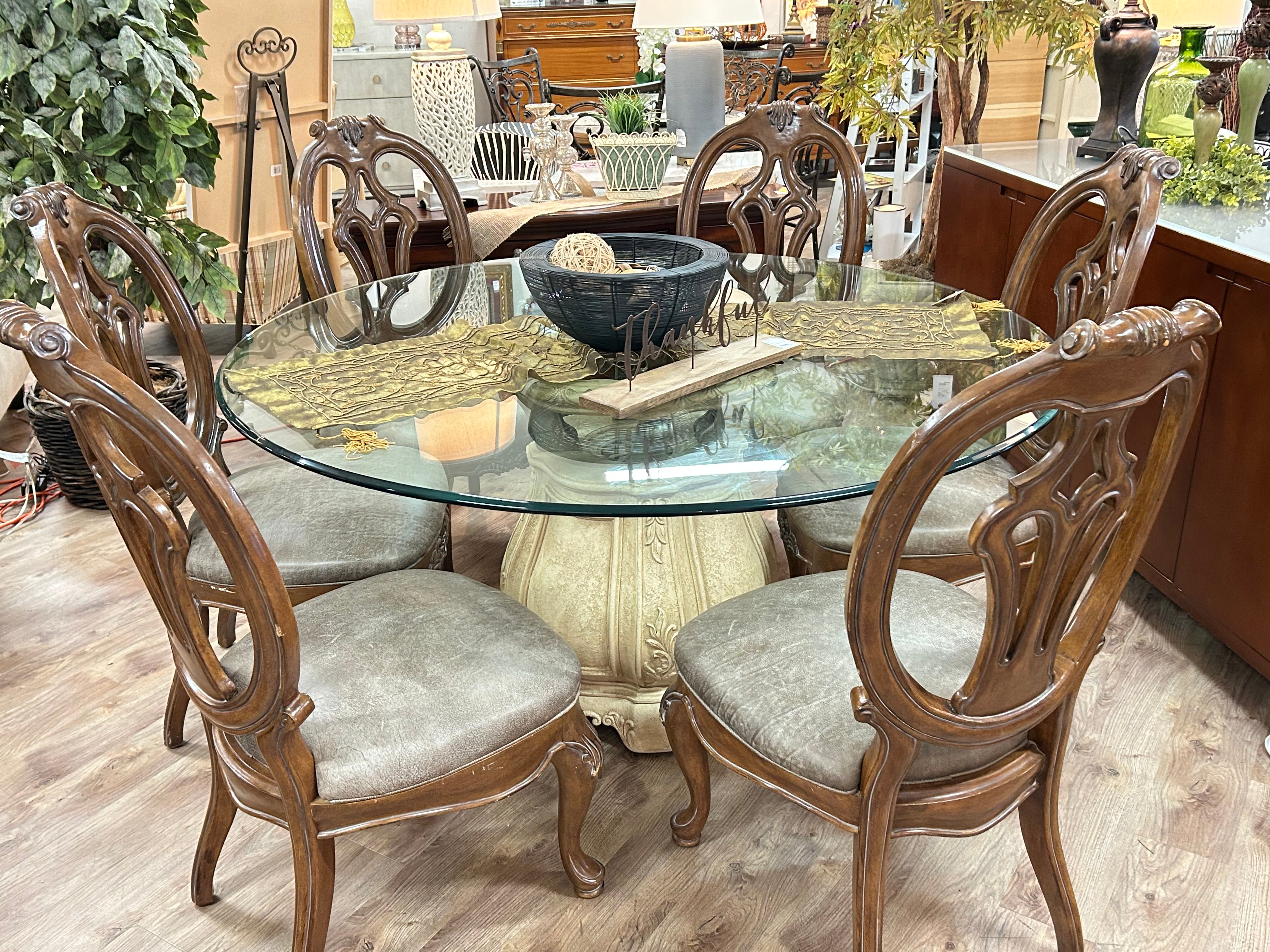Vintage Round Glass Top Table w/6 Chairs, 63"D X 31"H