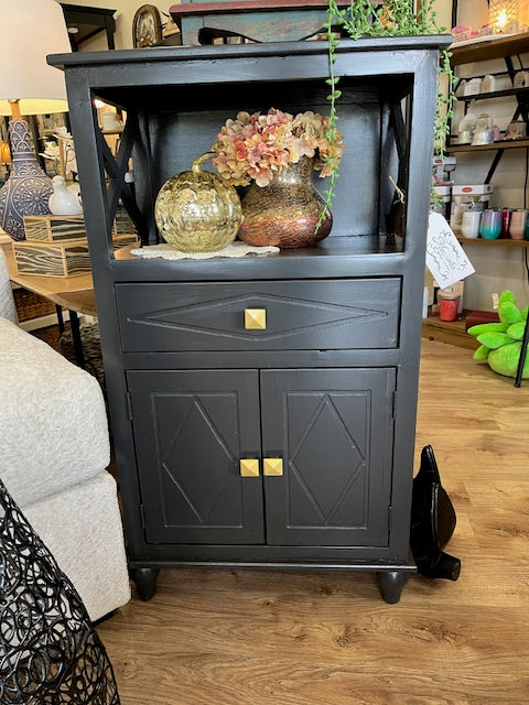 Black Cabinet w drawer and shelves, 22"W x 13"D x 38"H