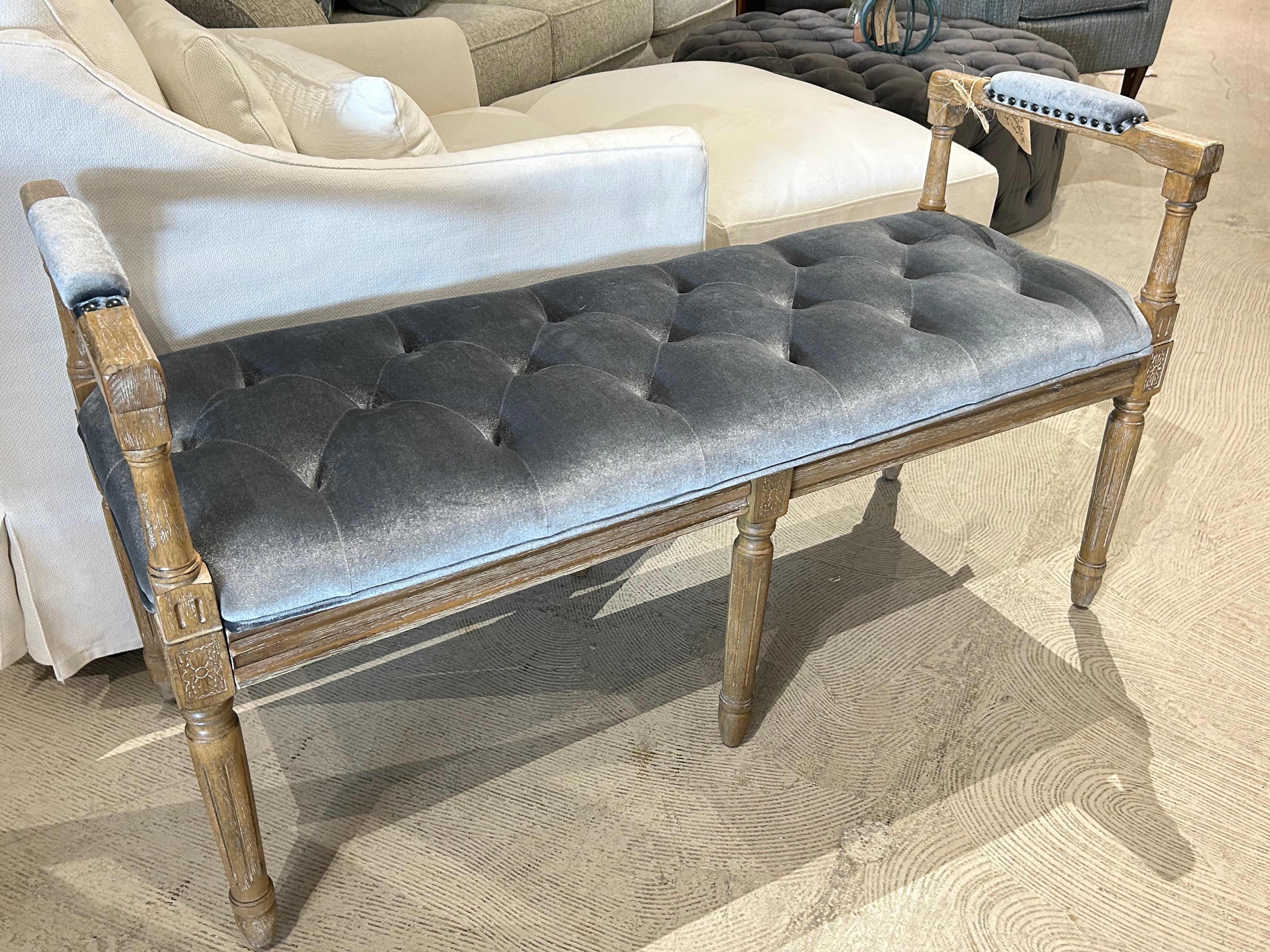 Silver/Blue Plush Upholstered Bench, 48"W X 18"D X 18"H