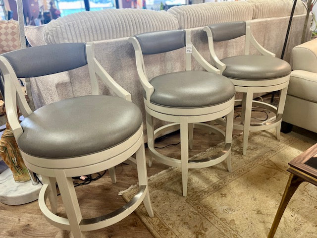 Set of 3 grey & white swivel counter stools, 35"H x21"W x 26"D, seat height 25",